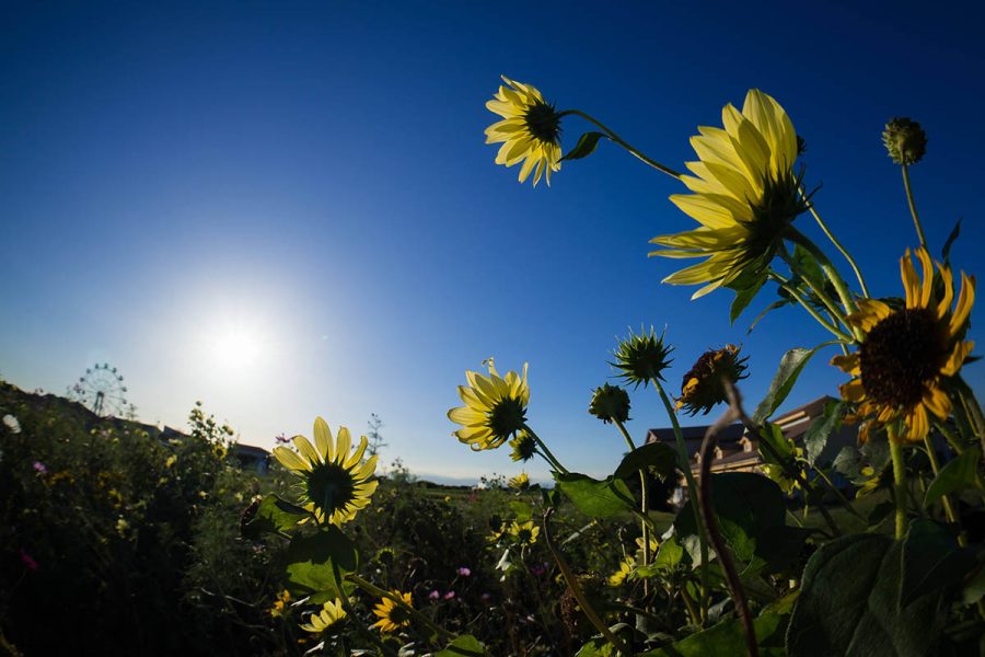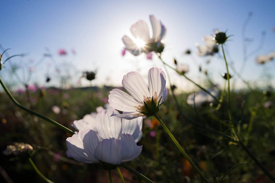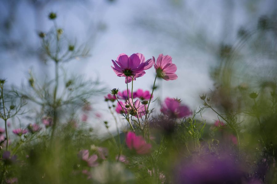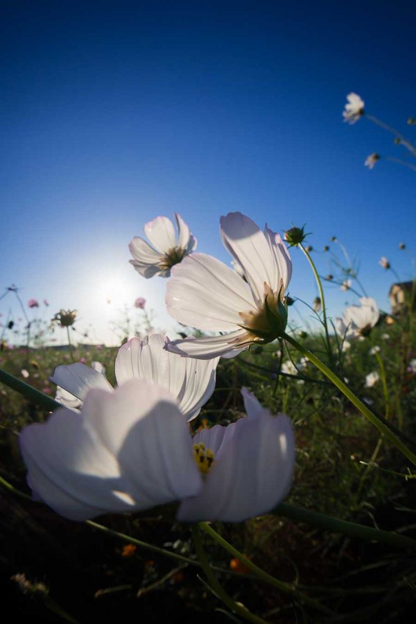 今年のコスモスは夏の高温と少雨で生育が遅れているようです。