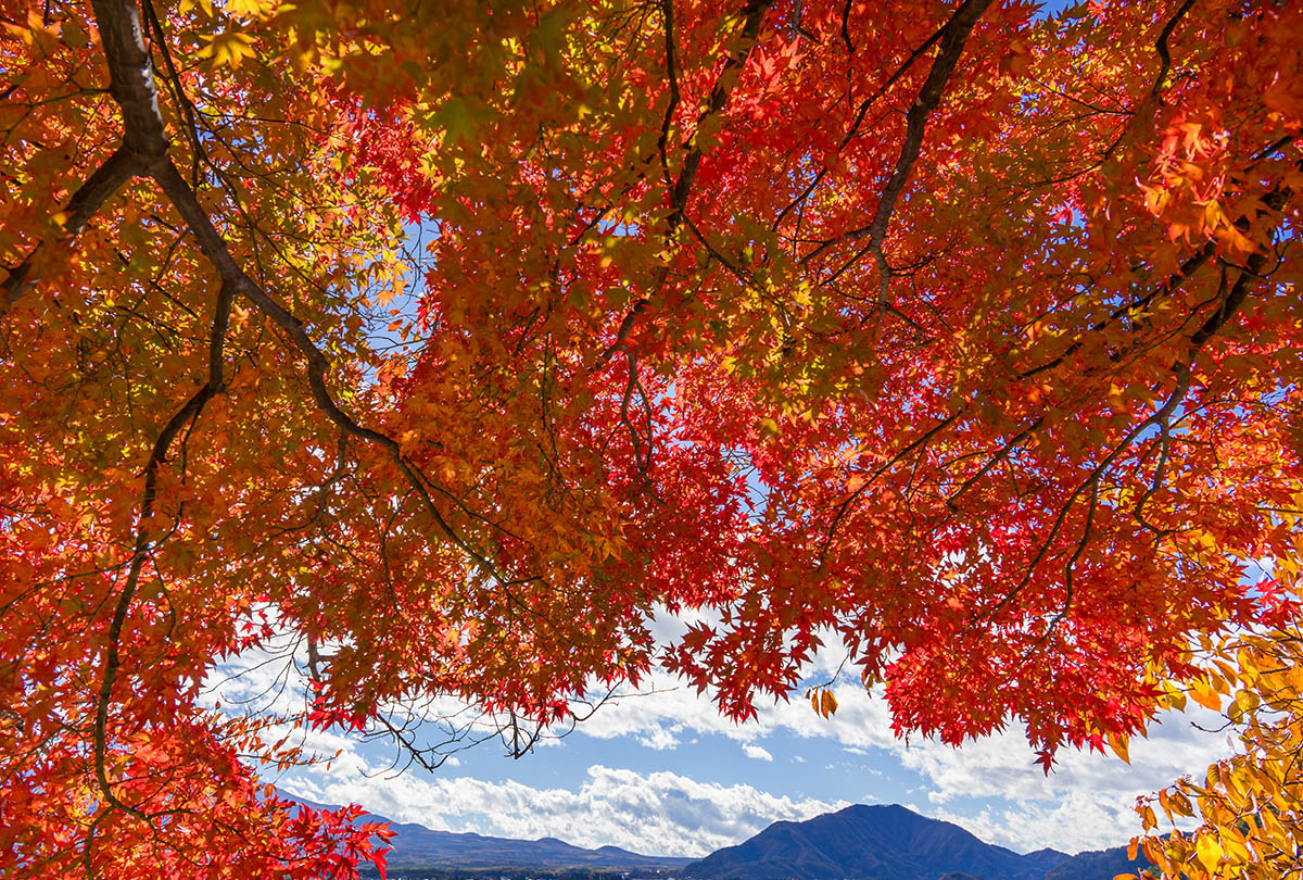 富士山と紅葉の組み合わせを見られるのですが、富士山は雲多めです。
