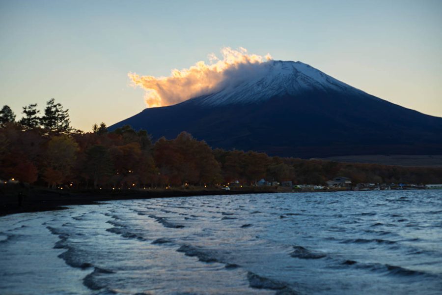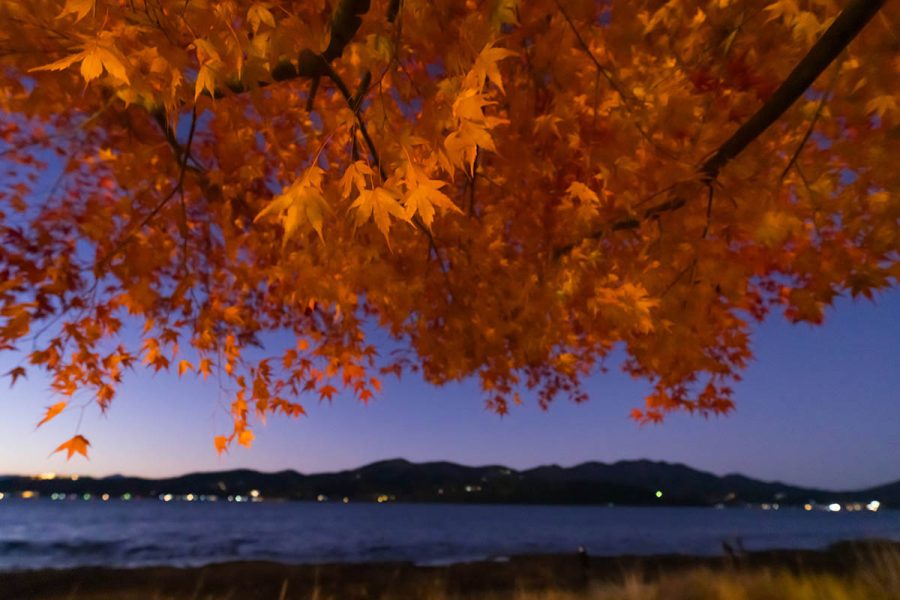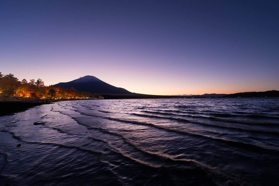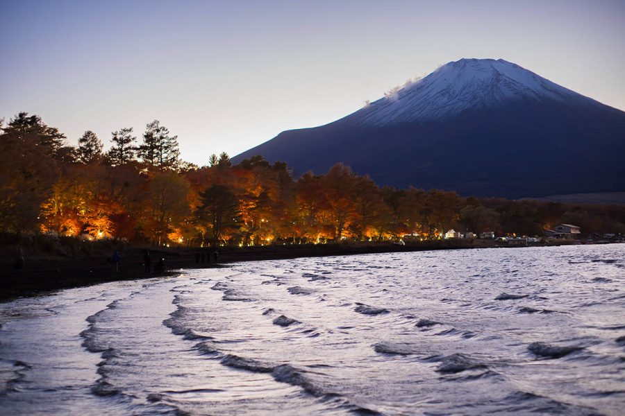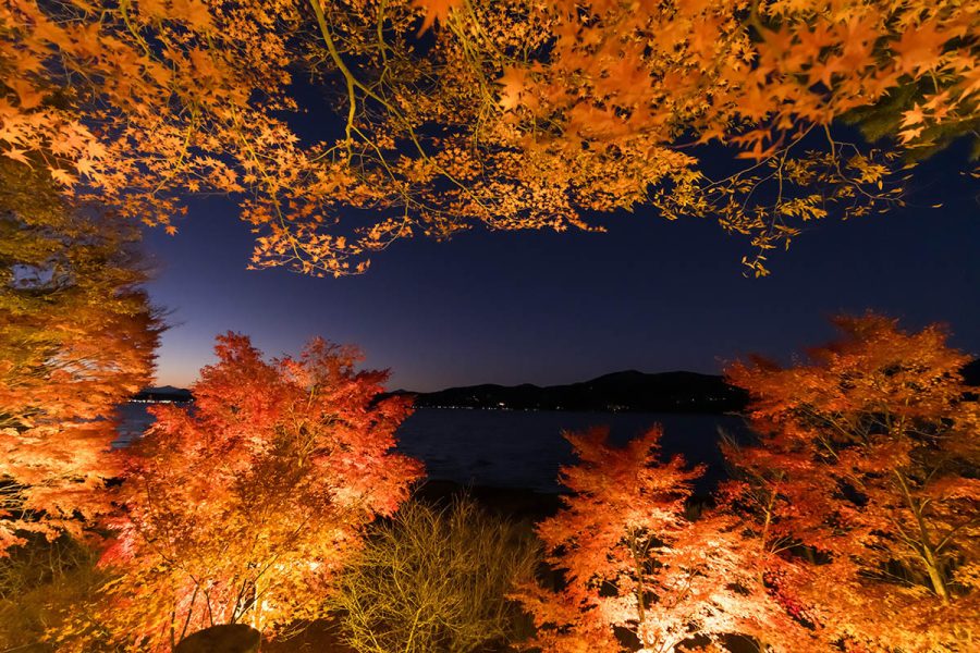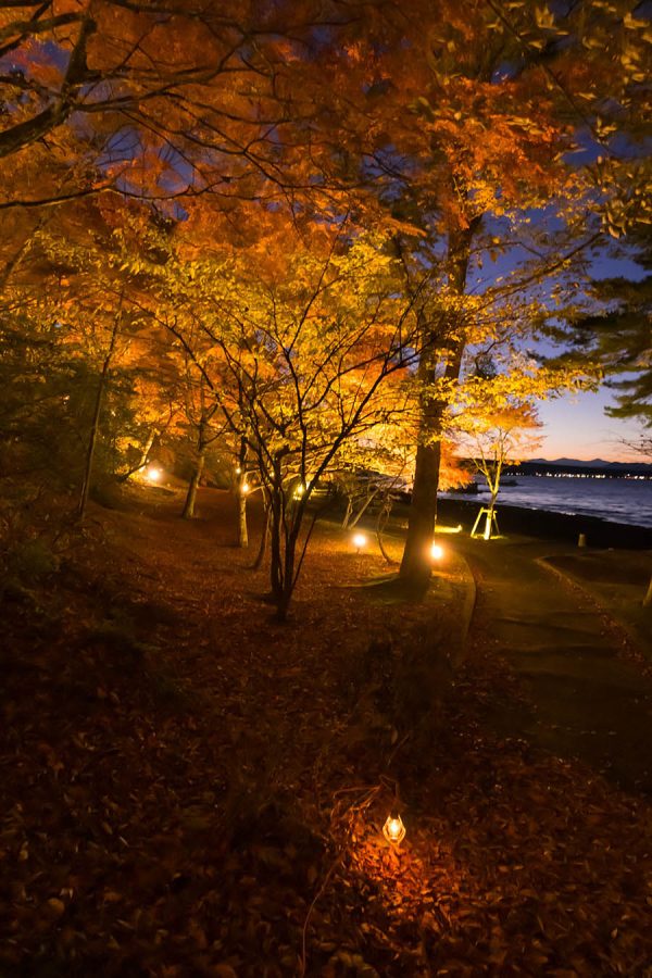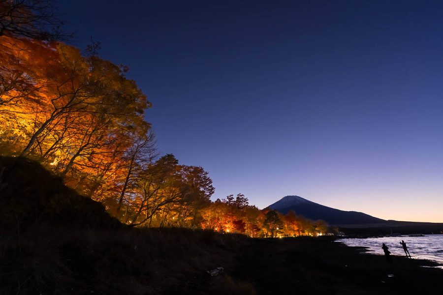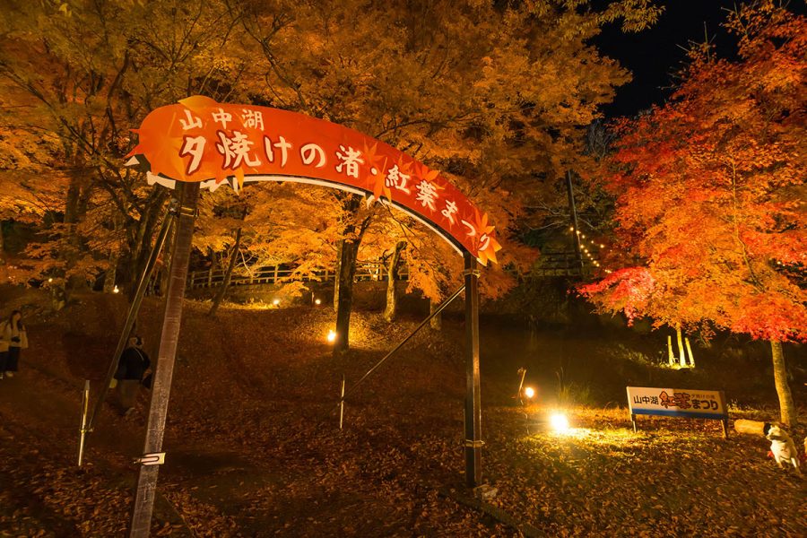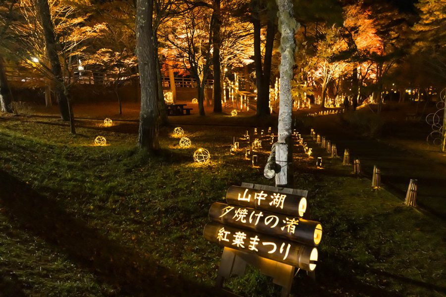 山中湖 夕焼けの渚 紅葉まつりが10/31から11/16まで開催されています。夜はライトアップされます。