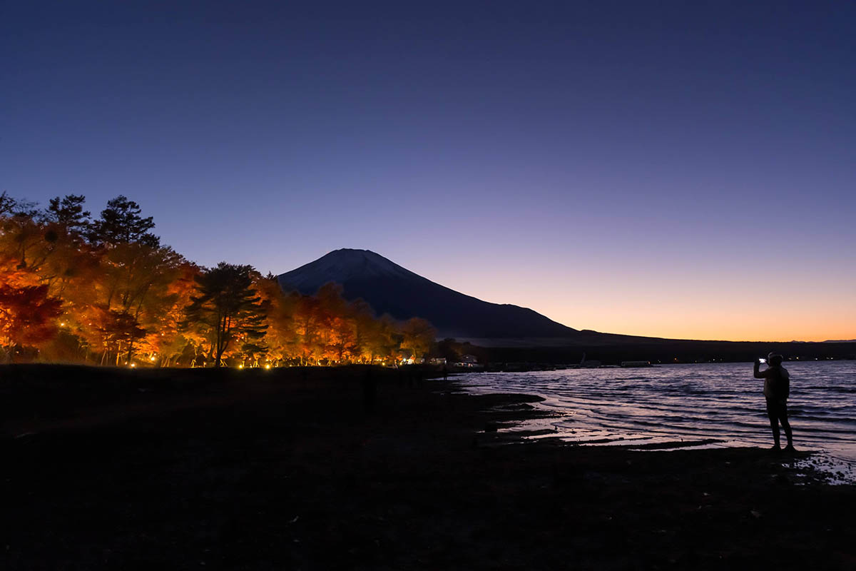 山中湖 夕焼けの渚 紅葉まつりが10/31から11/16まで開催されています。夜はライトアップされます。