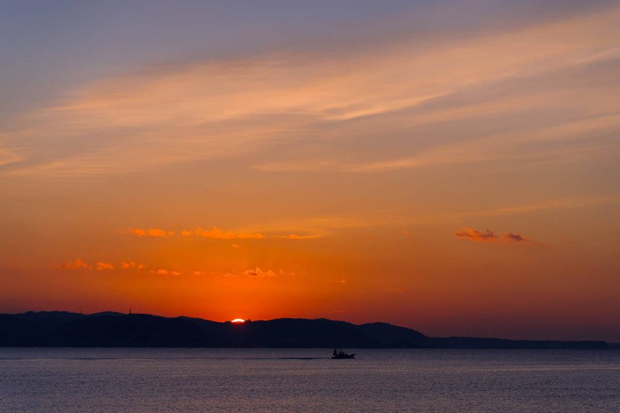 朝焼けといいますか日の出前の青みがかった空と太陽の赤さが美しいのですよね。