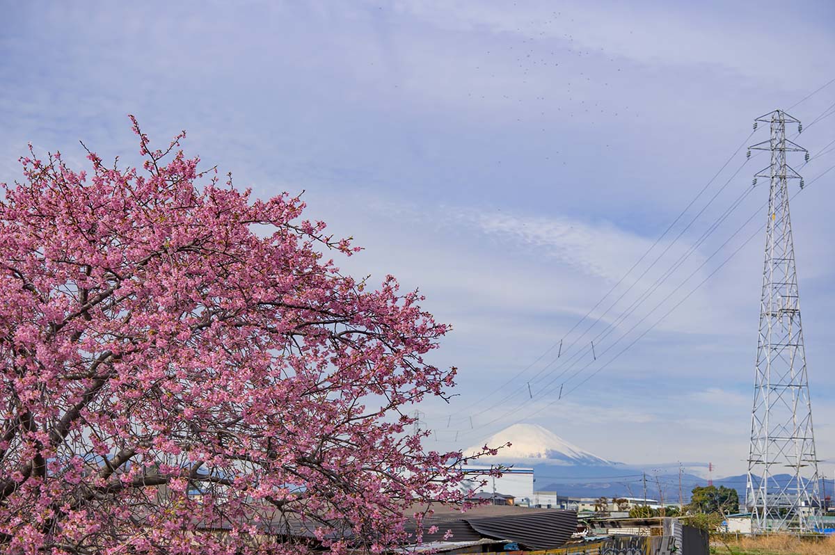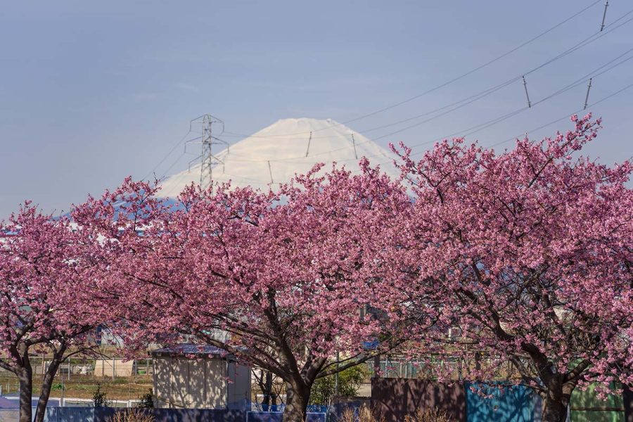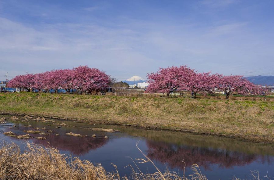 対岸から、河津桜のあいだに富士山が見えます