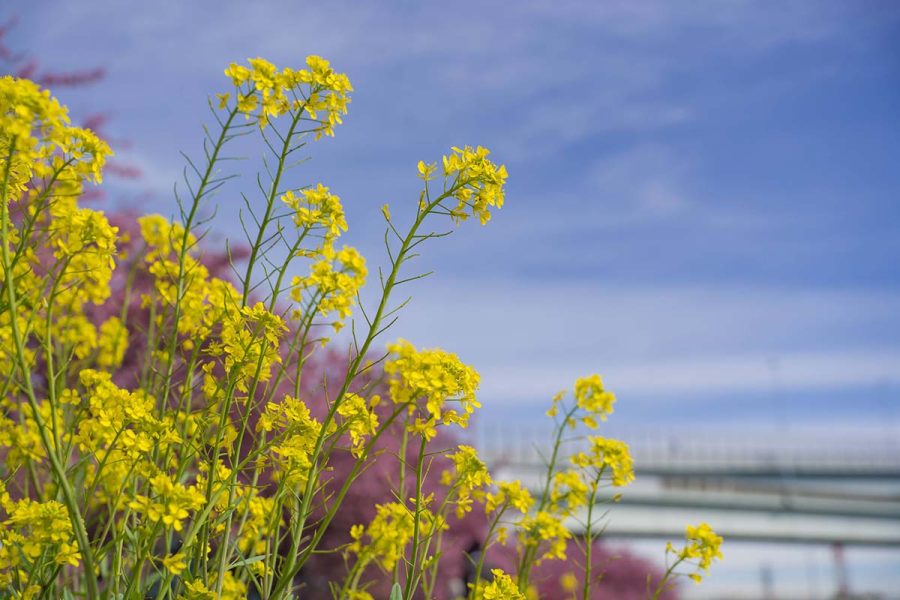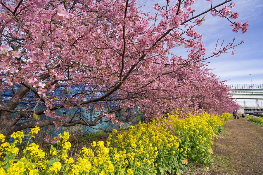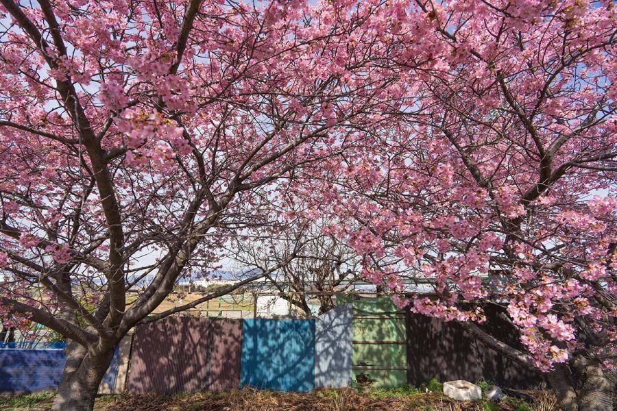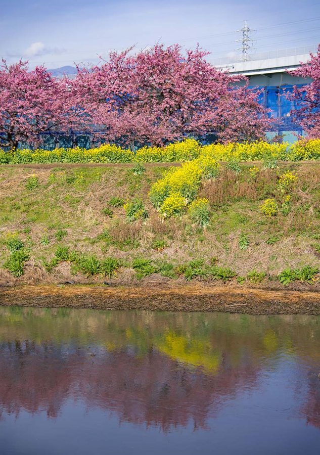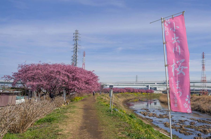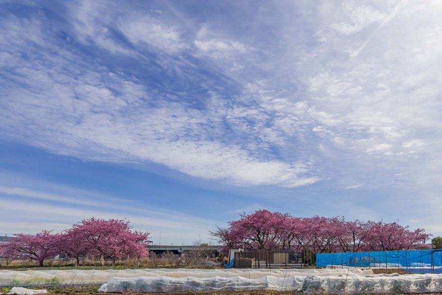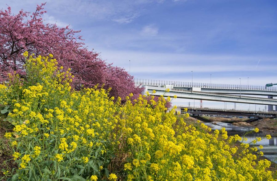 毎年、上流の藤沢で彼岸花を見に行くおなじみの場所なのですが、今回はもっと下流の茅ヶ崎の河津桜を見に行きました。新湘南バイパスから圏央道に分岐する茅ヶ崎JCTのあたりです。