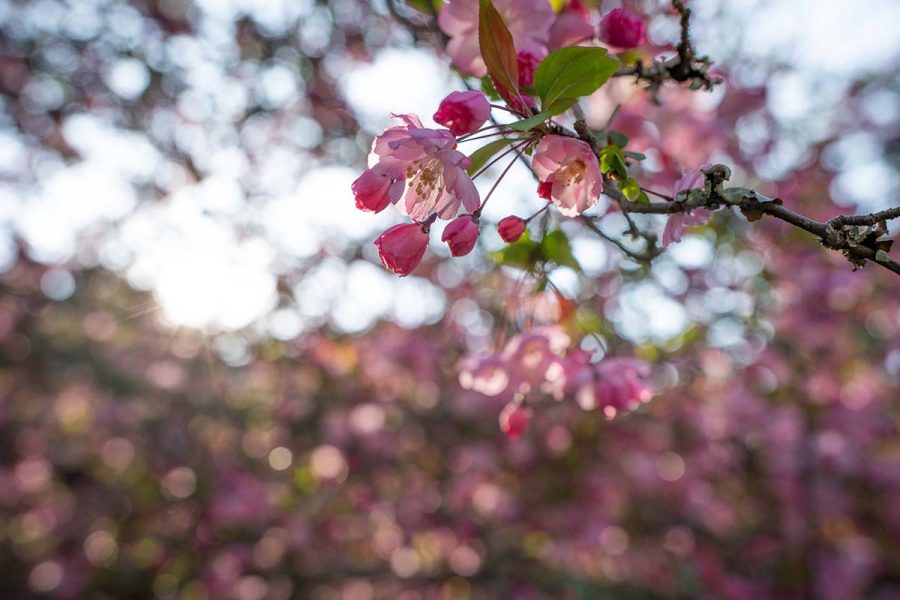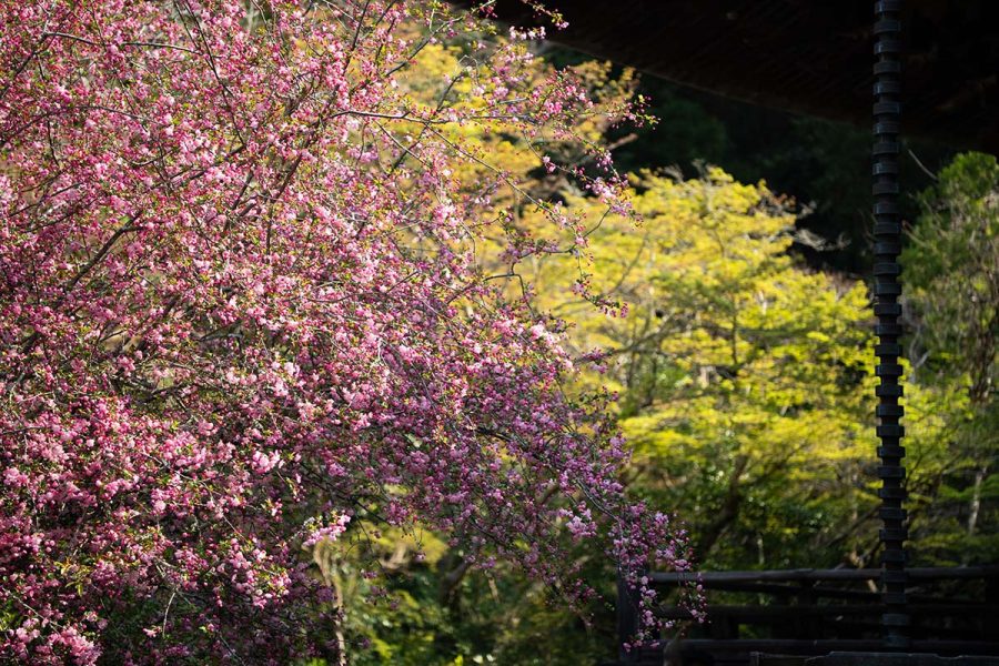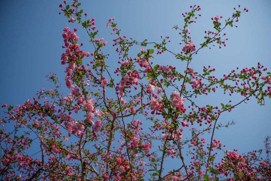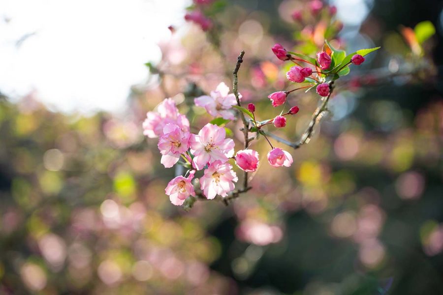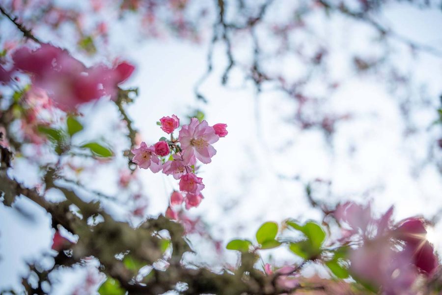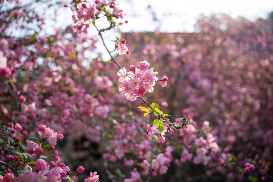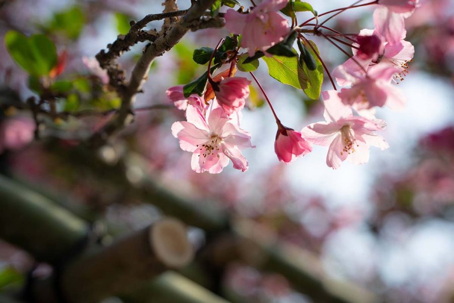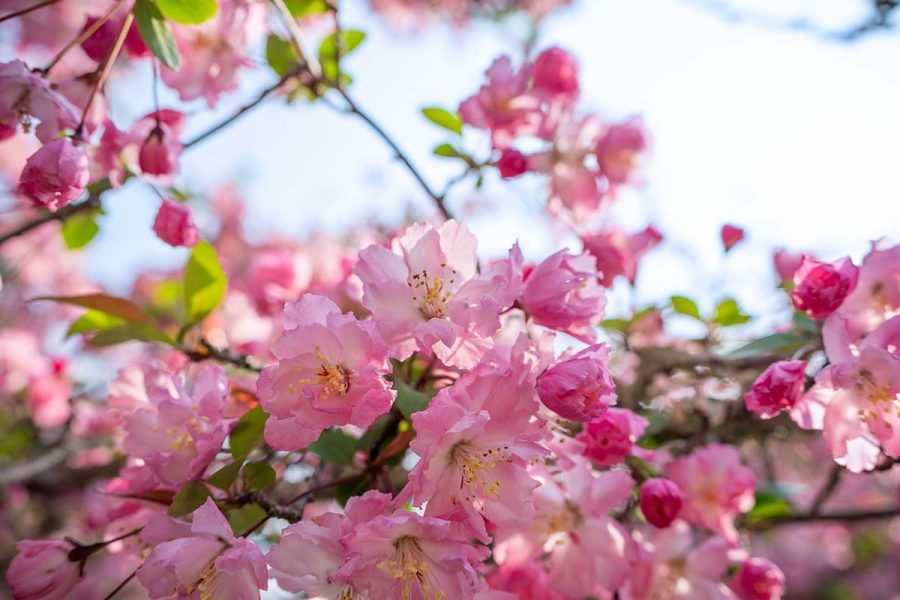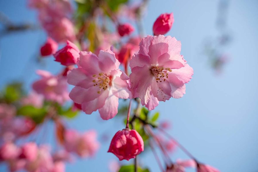 遠目に見ると濃いピンクの桜? にも見えますが近くで見ると花びらの中心部が薄くグラデーションになっていて、枝も細長く広がっています。
